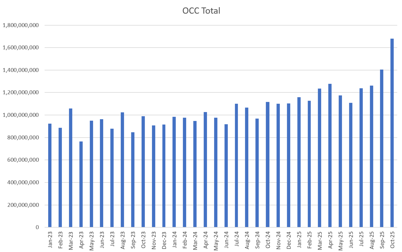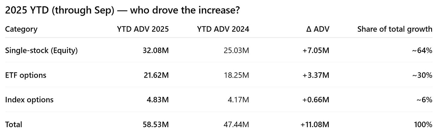 Total market options volume (Jan to Oct 2025) is up ~50% YTD, with SPX 0DTE contracts up ~62% YoY.