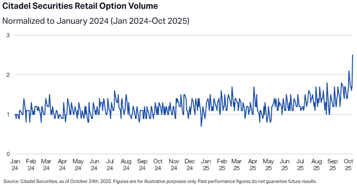 Retail option volume is now ~2.5× its January 2024 level (source: Citadel).