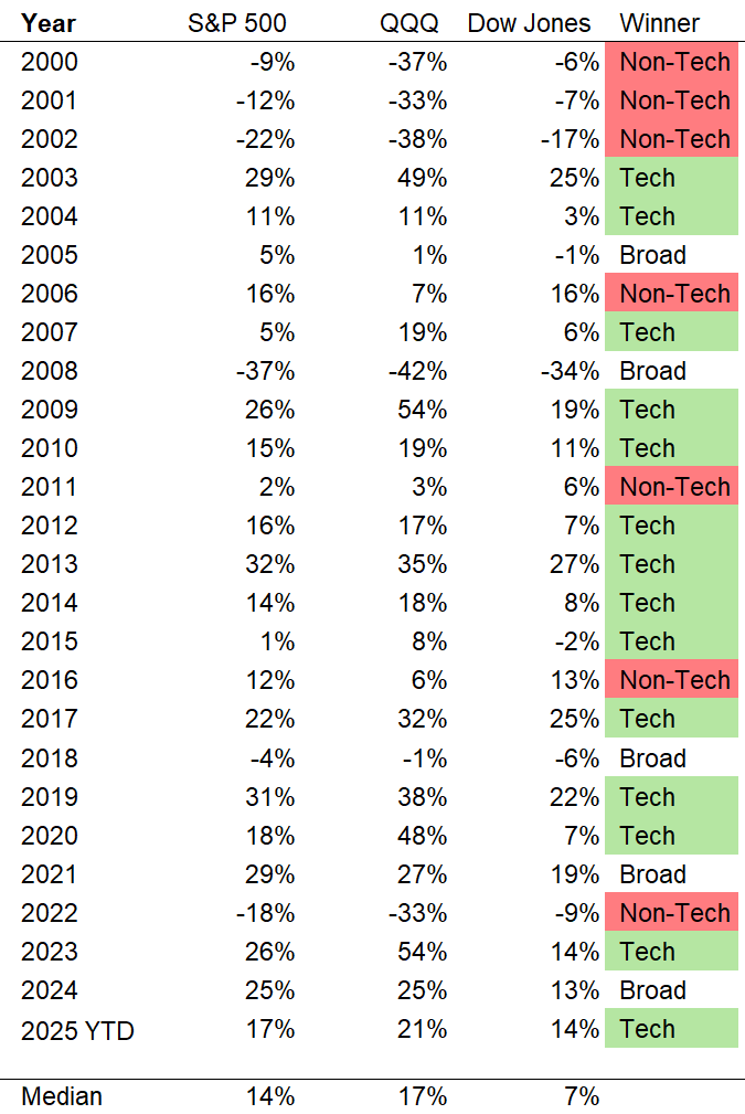 Tech outperforms in: falling or low rates, disinflation, easing liquidity, scarce growth, and strong secular tech earnings.Dow (Non-tech / value-heavy): Wins when markets favor near-term cash flows and dividends.