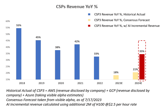 FY24 consensus for cloud growth: $230B, a $40B increase (+20% YoY) — AI doesn’t clearly show up in that number