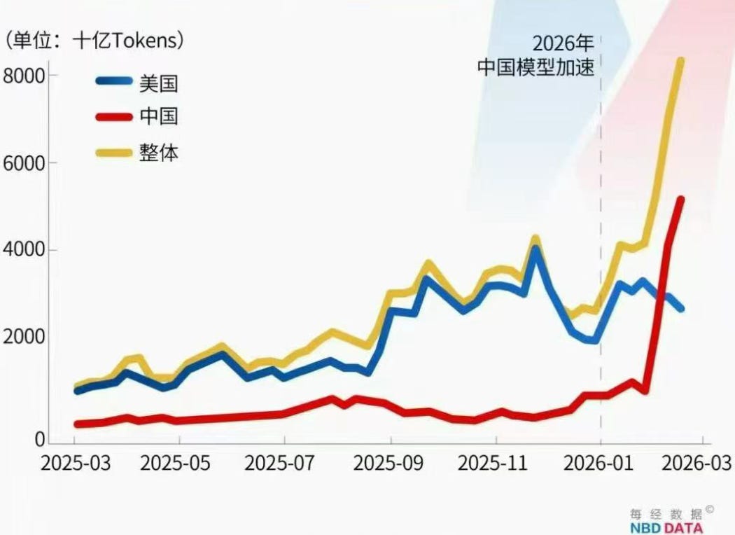 Global AI model API aggregator OpenRouter data shows that during the week of the 9th–15th, Chinese models reached 4.12 trillion tokens in API calls, surpassing U.S. models for the first time, which recorded 2.94 trillion tokens in the same period.